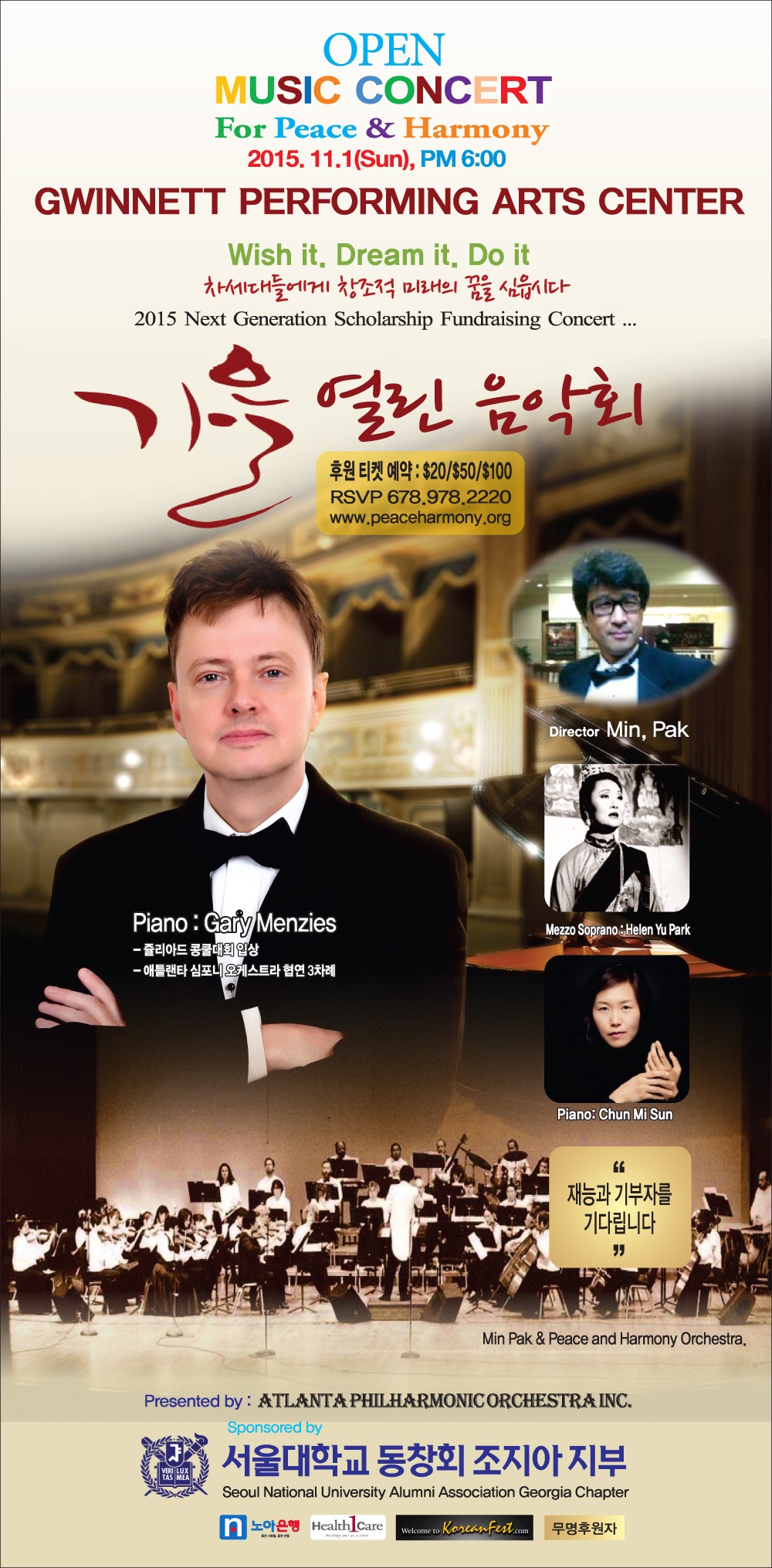 On a rainy Sunday evening on the first day of November, Min Pak and the Peace and Harmony Orchestra gave a performance at the Infinite Energy Center. The concert was sponsored by the Seoul National University Alumni Georgia Chapter to benefit the youth music education and featured several accomplished, talented performing artists such as Gary Menzies on piano, Chun Mi Sun on piano, and Felix Farrar on violin. Also featured were mezzo-soprano Helen Yu Pa…