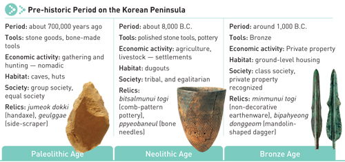 People began living on the Korean Peninsula and its surrounding areas from some 700,000 years ago. The Neolithic Age began some 8,000 years ago. Relics from that period can be found in areas throughout the Korean Peninsula, mostly in coastal areas and in areas near big rivers.